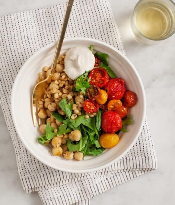 Assemble bowls with wheat berries, a few greens, roasted chickpeas and roasted tomatoes. Sprinkle with thyme leaves and/or other fresh herbs. Add a dollop of sun cheese (or other cheese) and dig in.
