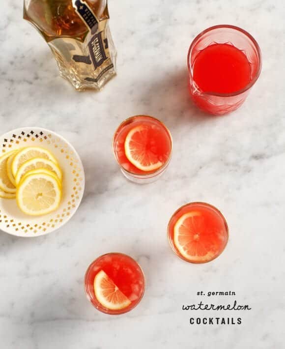 Pour watermelon juice into glasses with ice, then stir in St. Germain and Vodka to taste. St. Germain is sweet so depending on the sweetness of your watermelon, you may want to add more or less of it. For more tartness, add more lemon. For more booziness, add more vodka.