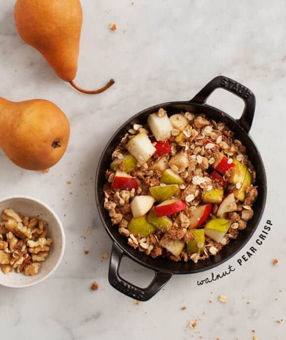 This pear crisp recipe is a delicious fall dessert! It serves 2, but you can easily double it to serve more. If you do, bake the crisp in an 8-inch square or similar-sized baking dish.