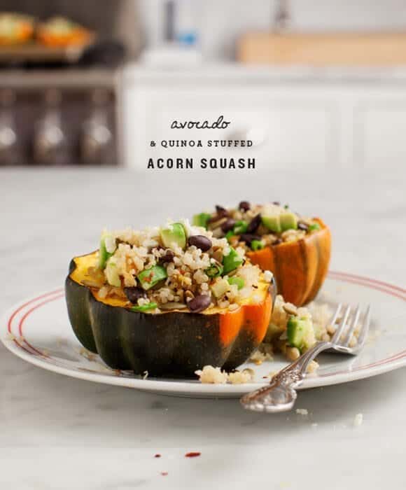 This stuffed acorn squash with spiced quinoa, avocado, and black bean salad is a delicious vegetarian dinner or Thanksgiving main course! Vegan and gluten-free.