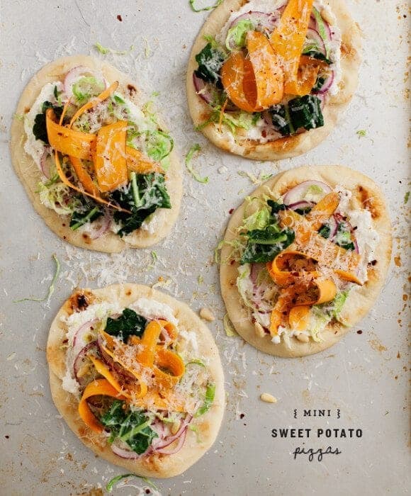 Brush a little bit of oil on each crust or flatbread and rub it with the open side of a ½ clove of garlic. Top each pizza with a slather of ricotta cheese, a few slices of red onion, a few shaved brussels sprouts, kale and a few ribbons of sweet potato.