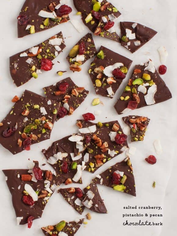 Cranberry & Pistachio Chocolate Bark is a delicious, quick & easy holiday treat. Topped with pecans, pistachios, cranberries, and coconut, this festive red & green recipe is a great holiday gift or addition to a cookie plate. Vegan and gluten-free.