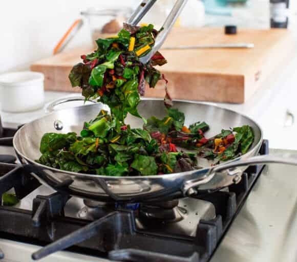 In a medium skillet, heat a few teaspoons of olive oil, then add the chard stems, salt and pepper. Next, add the chard leaves and toss until just wilted (less than 2 minutes). Finish with a squeeze of lemon and remove from heat.