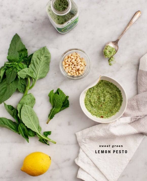 In a food processor, pulse together the pine nuts and garlic. Add the basil, lemon zest, Dijon mustard, red pepper flakes, a few generous pinches of salt, and a few grinds of pepper. Pulse until combined. With the food processor running, pour in the juice and olive oil and blend until smooth but still herb-flecked. Taste and add more olive oil, salt, pepper, and lemon zest to your liking.