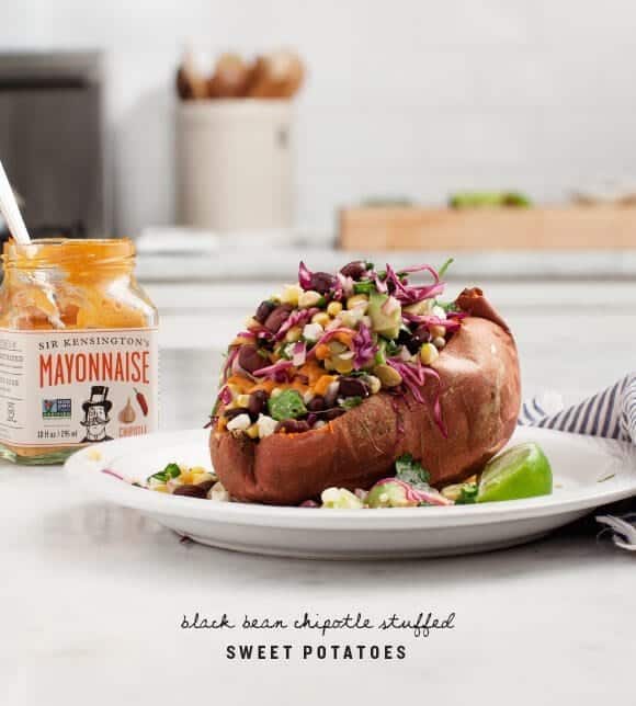 Slice open the sweet potatoes and stuff! If your sweet potatoes are large, cut them in half to serve four. Top each with toasted pepitas and a scoop of chipotle mayonnaise. Serve with the extra lime slices.