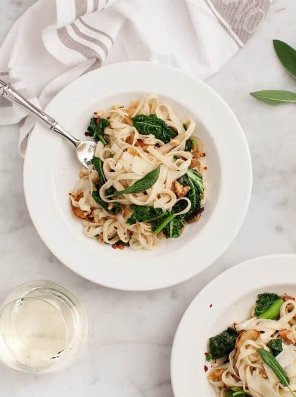 This delicious pasta would make a great winter weeknight dinner. Skip the cheese to make it vegan, and use whatever winter greens you can find.