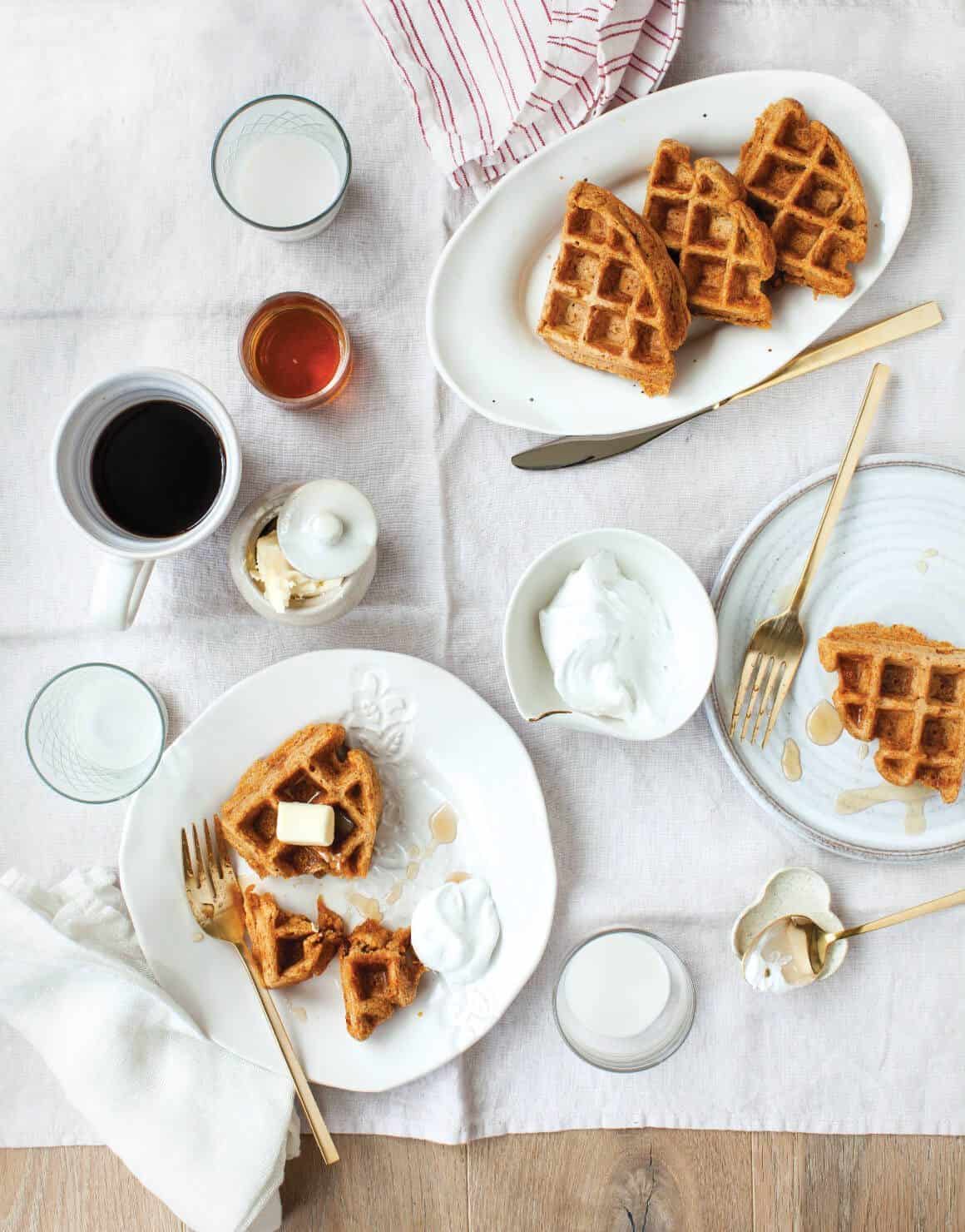 Scoop an appropriate amount of batter onto your waffle iron and cook until the edges are slightly crisp. Serve with maple syrup and the coconut cream, if using.