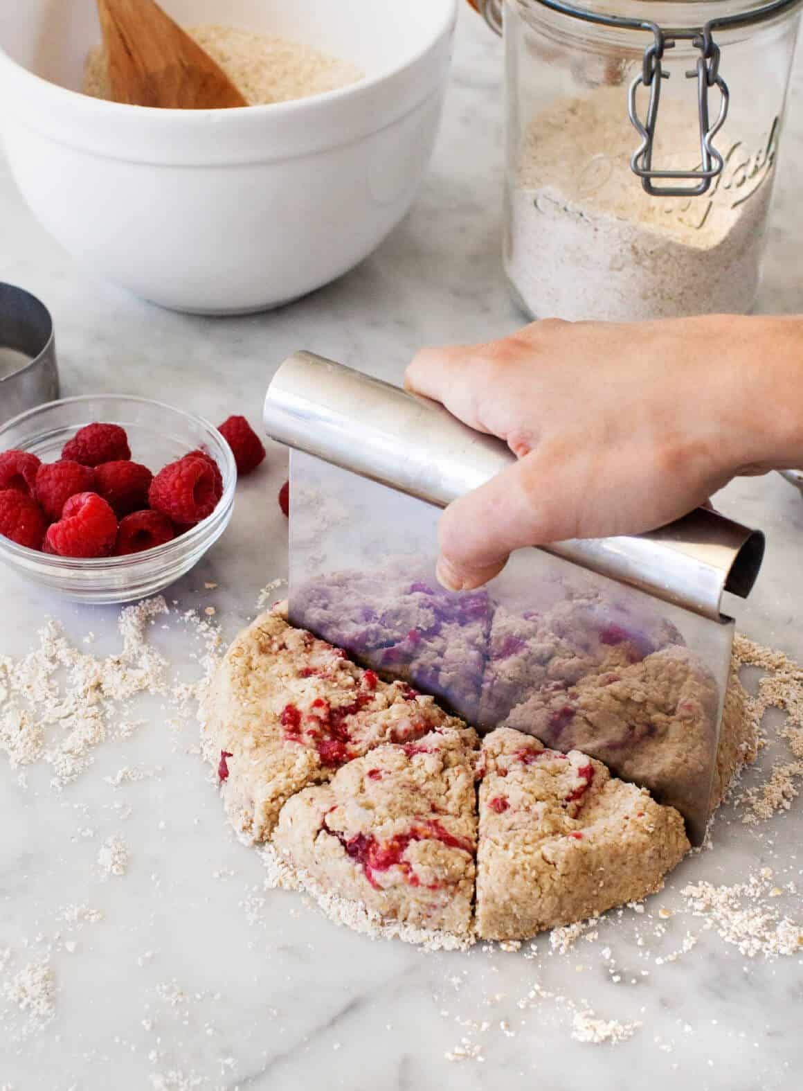Turn the dough out onto a floured surface and knead gently several times, incorporating more flour if needed. Separate the dough into two halves. Working with one half at a time, pat the dough down and place ⅓ cup of the raspberries on one side of the dough. Fold the other side of the dough over the raspberries and press gently so that some raspberries show through. Shape the dough into a 1” thick round and slice into 6 triangles. Transfer the scones to the baking sheet. Repeat with the second half of dough.