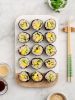 Assemble the sushi rolls: Place a small bowl of water and a kitchen towel near your work area as your hands will get sticky. Place one nori sheet, glossy side down, onto a bamboo mat and press a handful of rice onto the lower two-thirds of the sheet. At the bottom of the rice place your toppings (see picture). Don’t overfill or it will be more difficult to roll. Use the bamboo mat to tuck and roll the nori. Once rolled, use the bamboo mat to gently press and shape the roll. Place the roll to the side, cut side down. Repeat with remaining rolls.