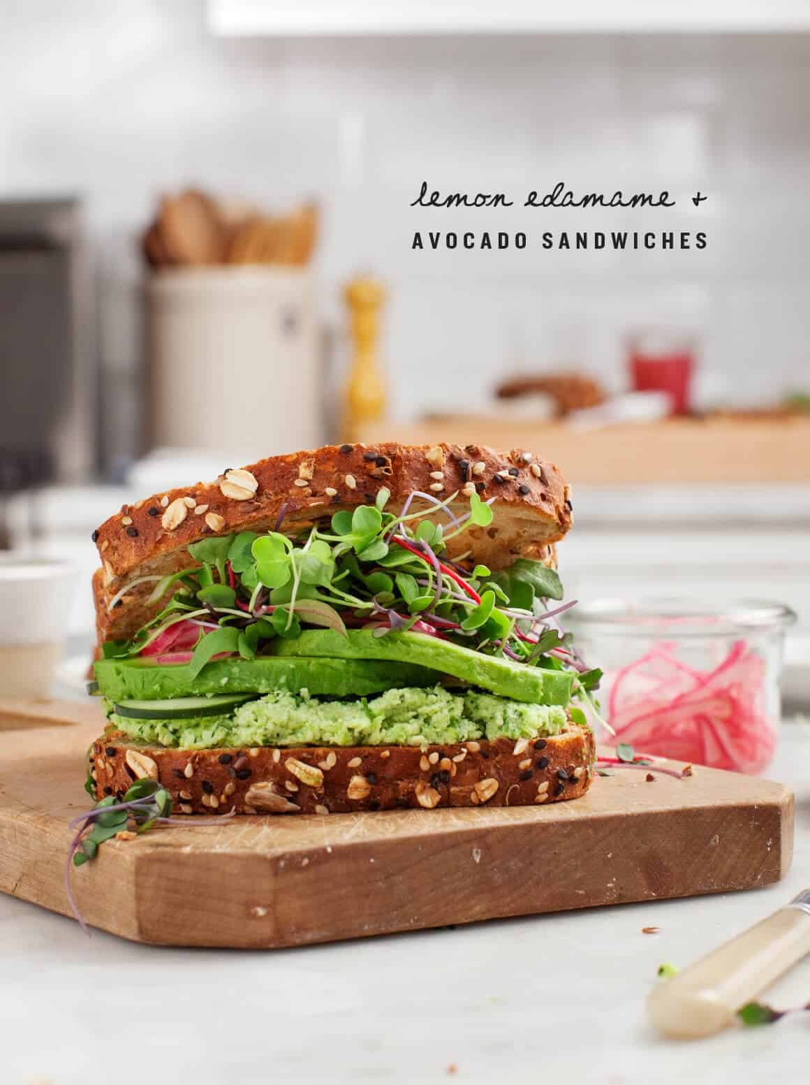 Make the sandwich filling: Place the edamame, cilantro, lemon juice, scallions, garlic, and sea salt into the bowl of a food processor. Pulse until chopped. Add the olive oil and blend until smooth. Add up to 3 tablespoons of water to create a smooth, spreadable consistency. Season to taste and chill until ready to use. The filling can be in advance and stored in the fridge for 3 to 4 days.