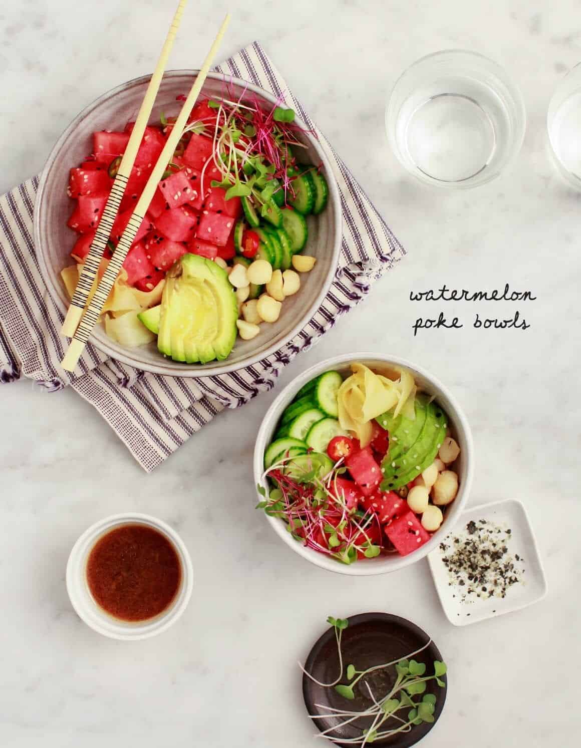 This watermelon vegan poke bowl recipe is super refreshing & fun! Add a base of rice if you wish, but for me, the light, grain-free bowl is perfect on a hot summer day.