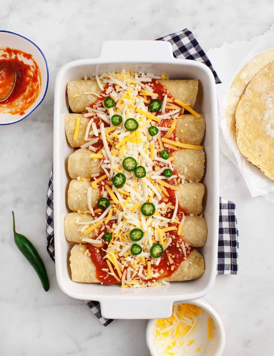 Vegan option: skip the cheese and serve the enchiladas with vegan sour cream mixed with a squeeze of lime on the side.