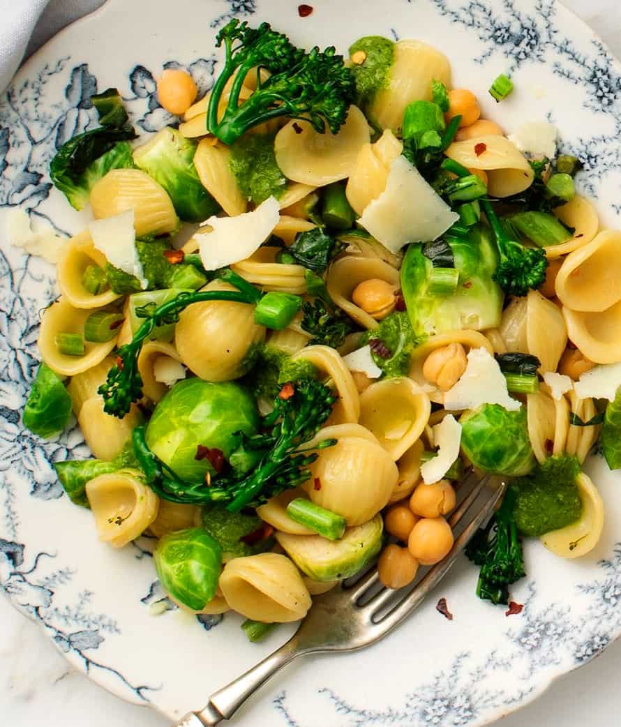Coat the bottom of the pasta pot with a generous drizzle of olive oil and heat to medium heat. Add the Brussels sprouts, kale stems, broccolini stems, and a pinch of salt and cook until nearly tender, stirring occasionally, about 10 minutes.