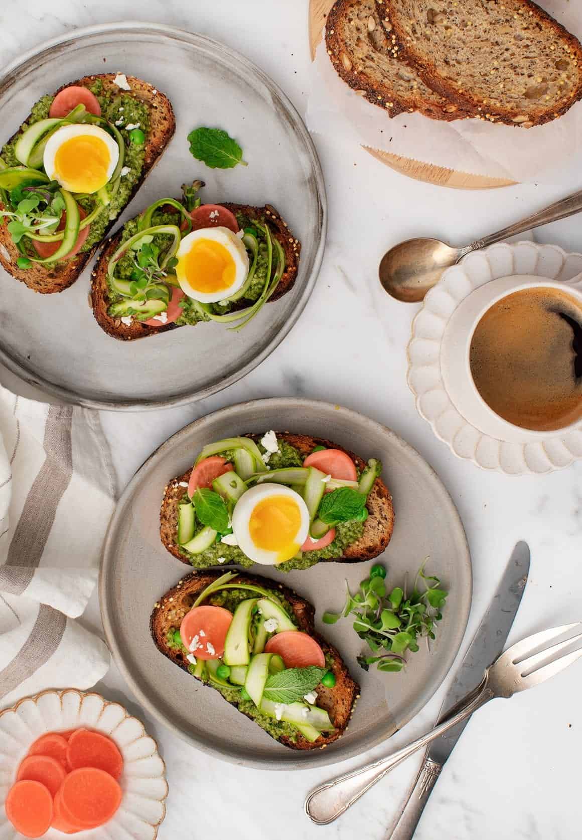 Assemble the toasts with the mint pesto, asparagus ribbons, radishes, peas, mint and feta cheese. Top with micro greens and soft boiled eggs, if desired.