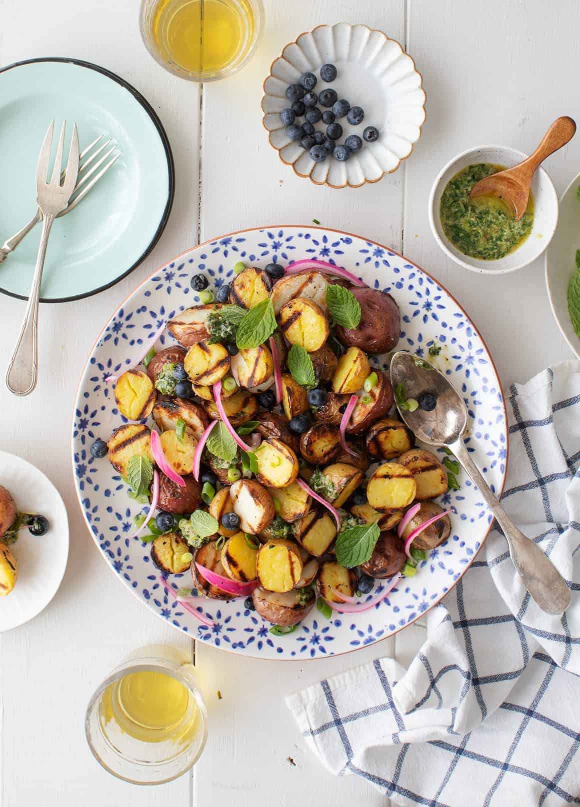 Assemble the salad with the potatoes, generous dollops of the dressing, blueberries, mint, the chopped scallions, and more dollops of the dressing. Top with pickled onions, if using. Serve warm or at room temperature.