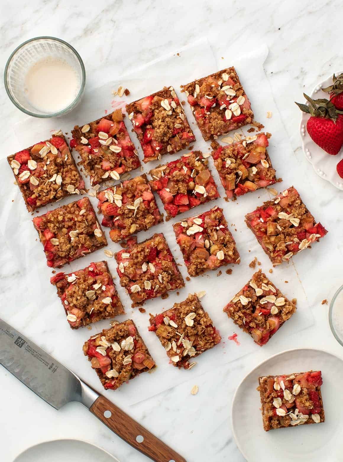 Spread the fruit filling over the crust, sprinkle with the remaining crumble, and garnish with some rolled oats. Bake for an additional 20 minutes, or until the fruit is soft and the crumble topping is lightly crisp. Let cool completely before slicing. If not serving the same day, store the bars covered in the refrigerator.
