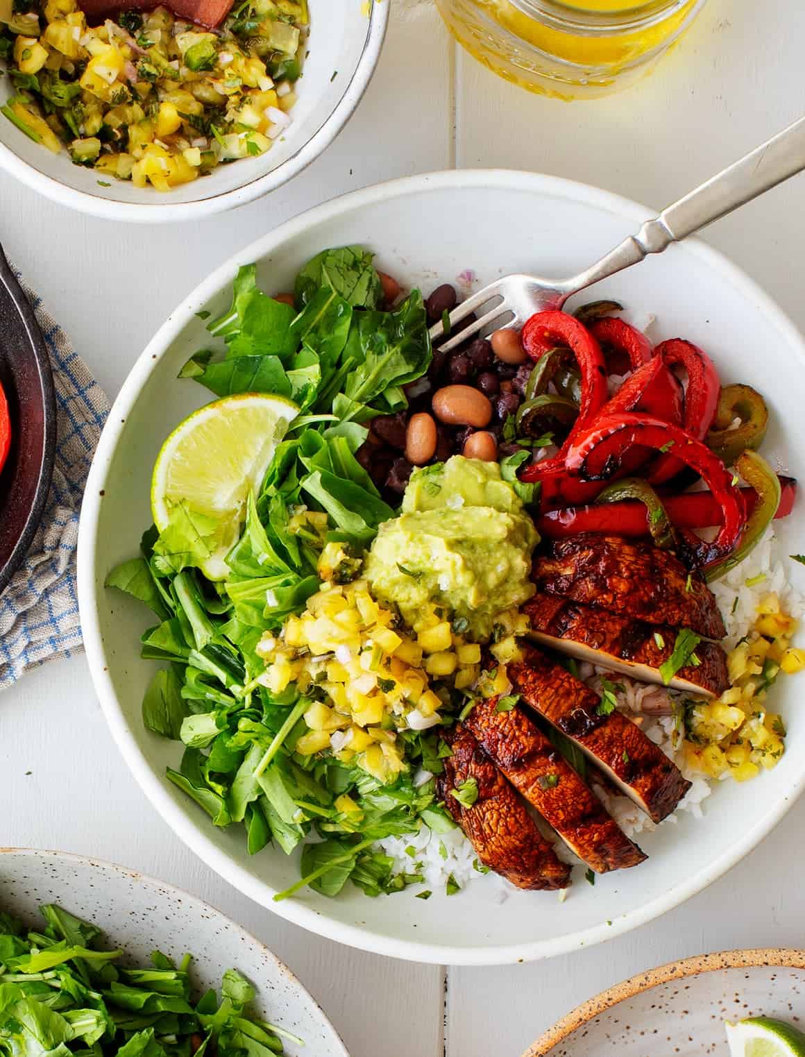 Assemble the bowls with the rice, beans, arugula, sliced mushrooms, peppers, guacamole, scoops of pineapple salsa, and cilantro. Serve with extra salsa and extra lime wedges on the side. (Note: If you would like your arugula and rice seasoned/dressed more, drizzle with olive oil, squeezes of lime and pinches of salt and pepper).