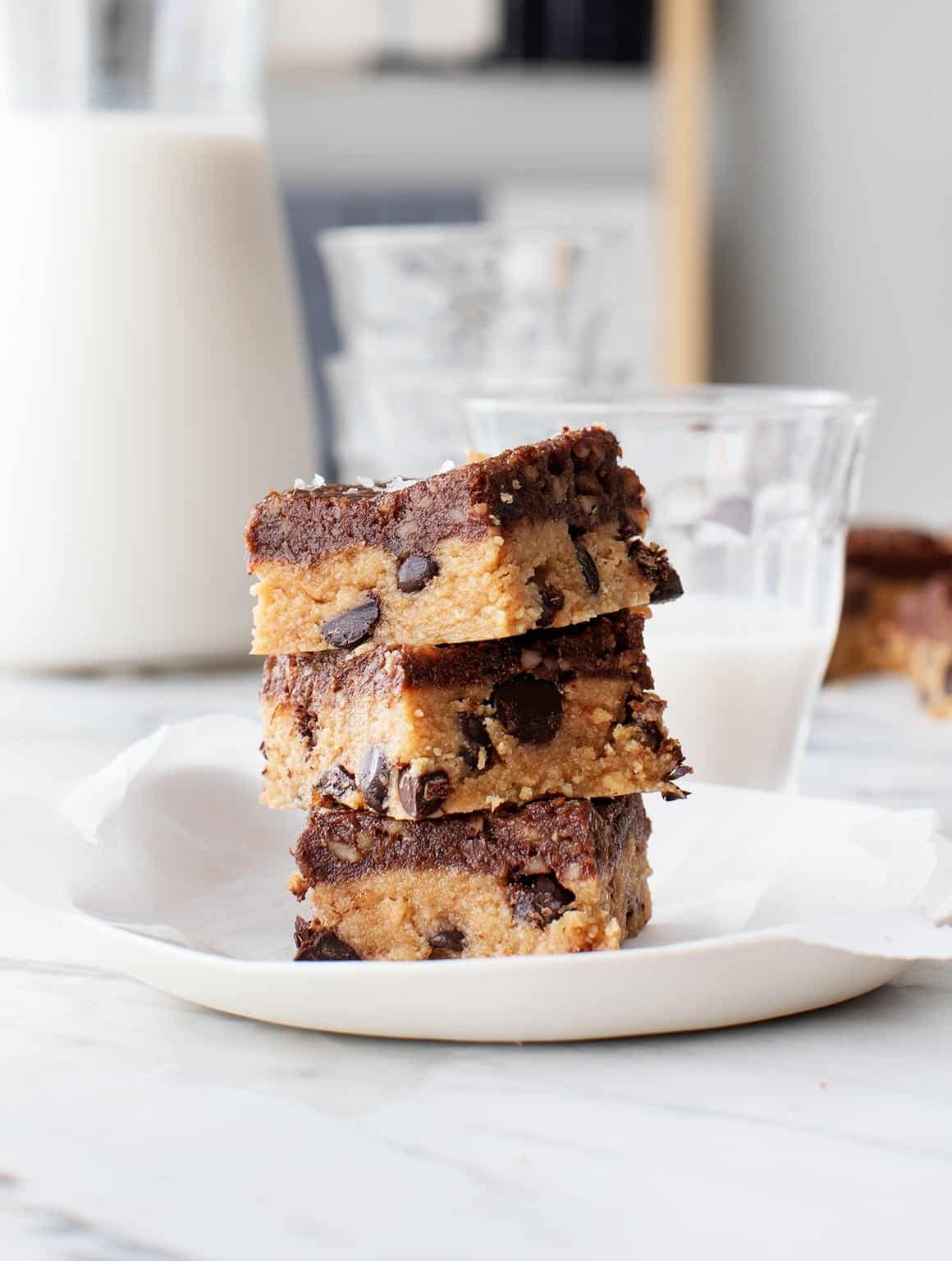 These peanut butter cookie bars are one of my all-time favorite treats! They have a delicious peanut butter chocolate chip layer with a rich cacao-date layer on top.