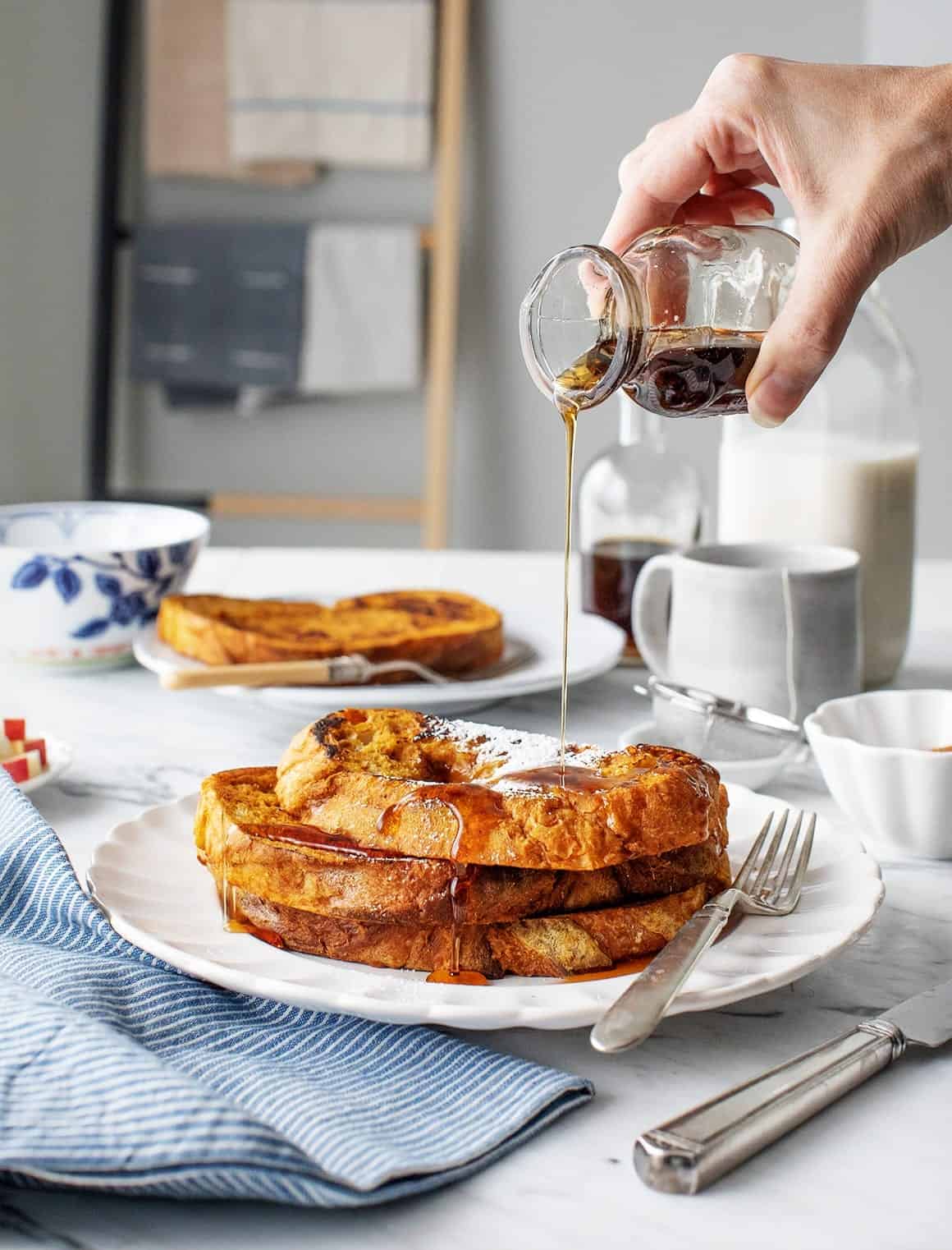 This pumpkin French toast is the ultimate fall breakfast! Pumpkin puree replaces the eggs that you'd find in traditional French toast, so this recipe is totally vegan. Use gluten-free bread to make it gluten-free.