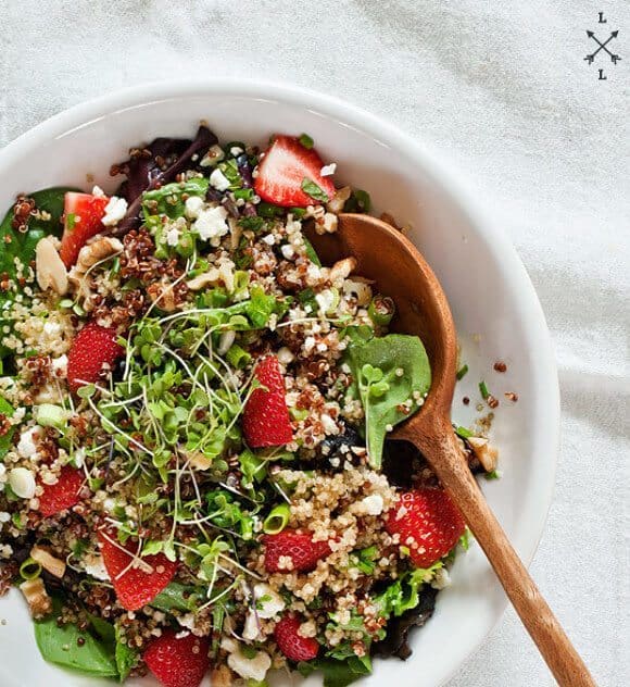 In a large bowl, toss together the quinoa, strawberries, feta, mint, scallions, walnuts, greens, and sprouts, if using. Pour in the dressing and toss again. Taste and adjust seasonings to your liking. I added a final squeeze of lemon juice and a drizzle of olive oil on top.