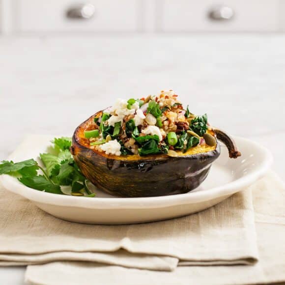 Scoop the filling into the cooked acorn squash, and top with toasted pumpkin seeds, more feta (if you wish), and a drizzle of olive oil and more honey.