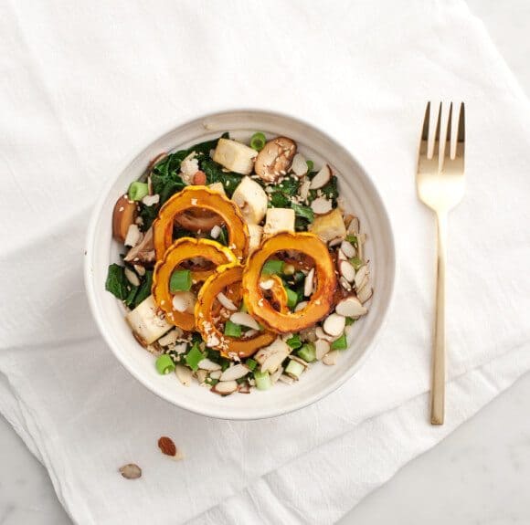 Drizzle squash slices with olive oil, salt and pepper, and roast for approx 20-25 minutes or until golden brown around the edges. (the time in your oven may vary). I also roasted my tofu cubes (with olive oil, salt & pepper) at the same time on a second baking sheet.