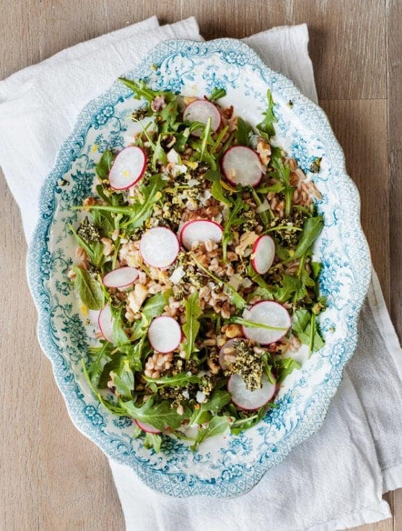 Finish the salad with radishes, a few more dollops of pesto, and another grating of cheese on top.