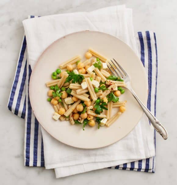 Cook your pasta in salty water until al dente. Toss the warm pasta together with the chickpeas, peas, feta, and most of the dressing. Add a little bit of pasta water if necessary to create a creamy consistency. Toss in the herbs and as much of the remaining dressing as you like. Taste and adjust seasonings.