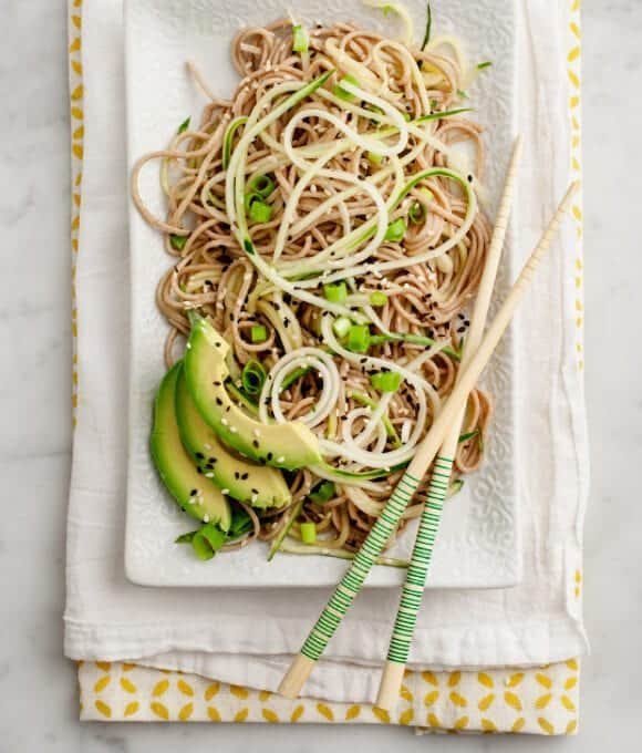 Toss the cucumber slices and scallions with the soba noodles. And tamari, rice vinegar, and ponzu and toss again. Taste and adjust seasonings. Top with sliced avocado and sesame seeds. Serve cold.