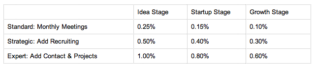 In an effort to standardize the process with FAST (and let everyone just get back to building great companies), Founder Institute and Orrick have denoted three “levels of company maturity” that have different implications for how to define the advisor-founder agreement: idea, startup, and growth. In addition, they qualify the terms with three “levels of engagement” that define how advisors will work with founders and have varying influence on how they are compensated: standard, strategic, or expert.