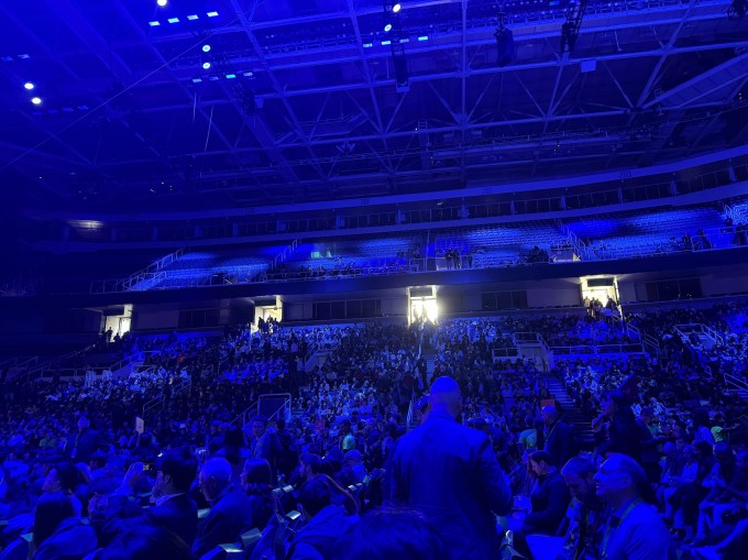 The crowd inside SAP Center waiting for Nvidia CEO Jensen Huang’s keynote.Image Credits:Maxwell Zeff / TechCrunch -